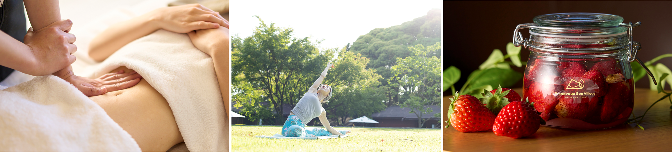 - ボディケアから、天然温泉での入浴、モーニングヨガ、酵素ドリンクづくり体験まで、心身ともに整える充実のプログラム。