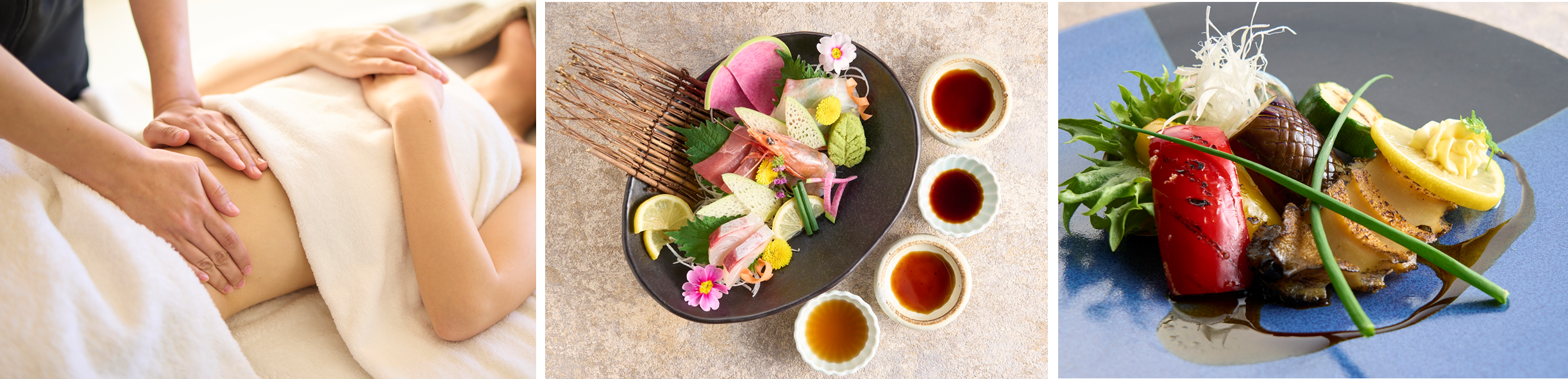 そのほか、宿泊者限定でご利用いただける、海のミネラルが豊富で驚くほど黒く、美肌効果が期待できるナトリウム炭酸水素塩鉱泉が特徴の天然温泉『紅葉乃湯』でのご入浴や、芝生ガーデンで朝日を浴びながら身体を動かす朝食前のモーニングヨガなど、腸内環境の改善につながる生活リズムを取り戻すための充実した2日間をお過ごしいただけます。