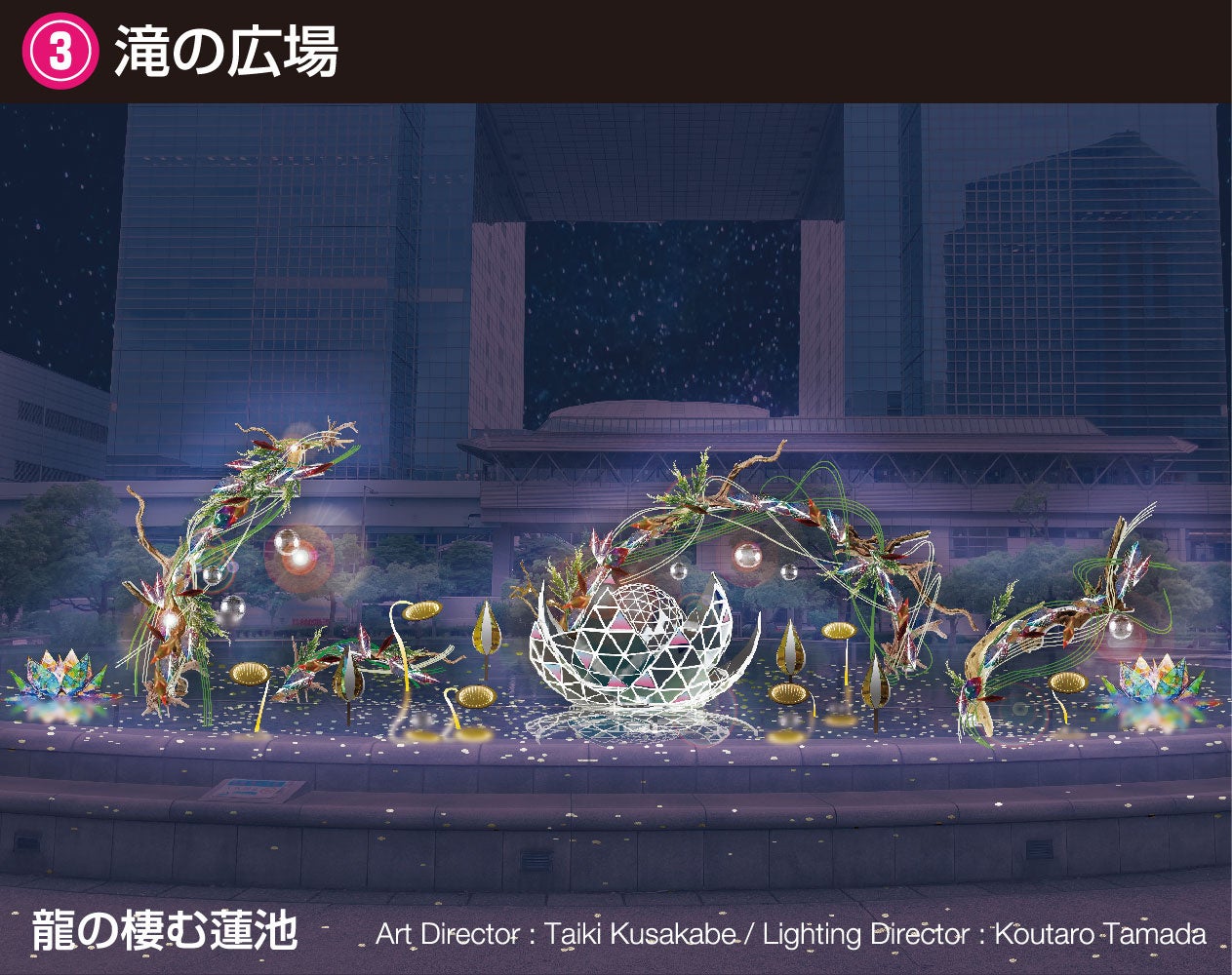 龍は自然界に流動する大いなる力の象徴です。蓮は泥の中から茎を伸ばし汚れなき綺麗な華を咲かせます。龍に守られた蓮池は、自然に対して畏怖と畏敬の念を持つ日本人の美しい心を表しています。臨海副都心の現代的な都市風景と自然神話が融合し、未来へ向けて光を放ちます。