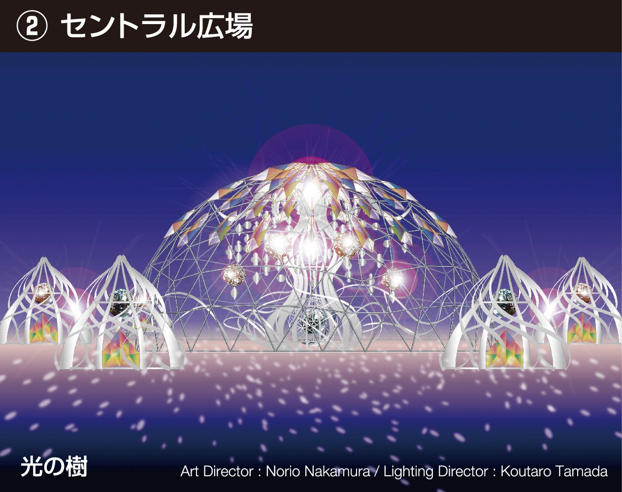 煌びやかな光のパレスの中にそびえ立つ光の樹。その先に浮かび上がる光の有機的な曲線は時空の揺らぎを表現しています。また、それは水面の揺らぎにも似ています。金属の屈折反射した不思議な光の世界をお楽しみください。