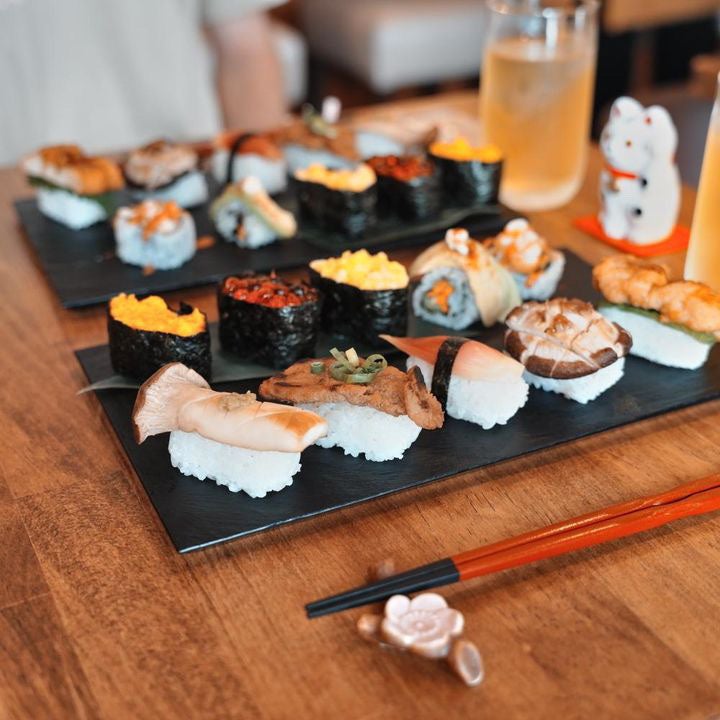 茗荷・キノコなどの伝統的な『野菜寿司』に加え、植物性の肉・エビフライ・いくら・卵など新たなジャンルである『ヴィーガン寿司』を提供しています。
