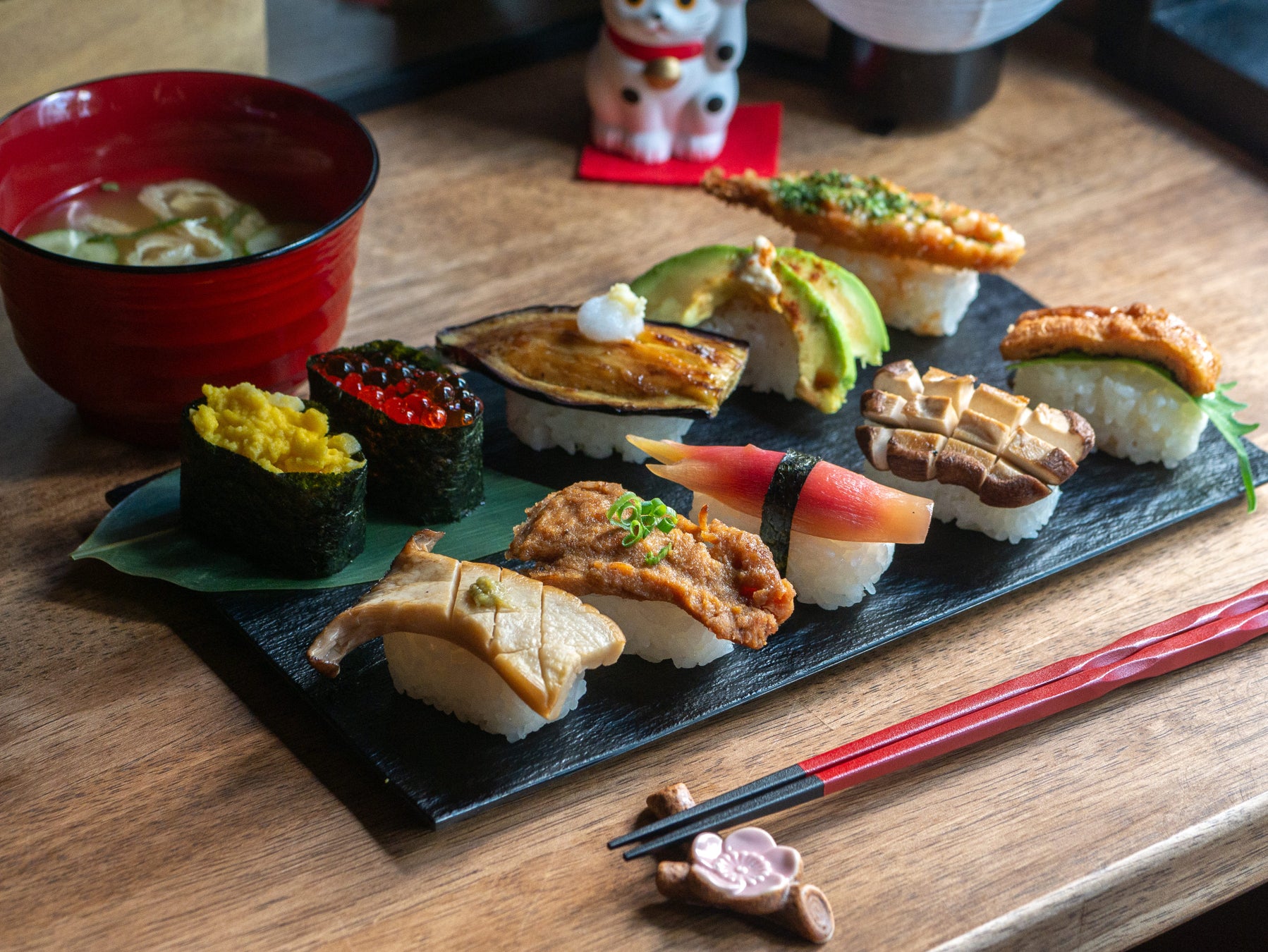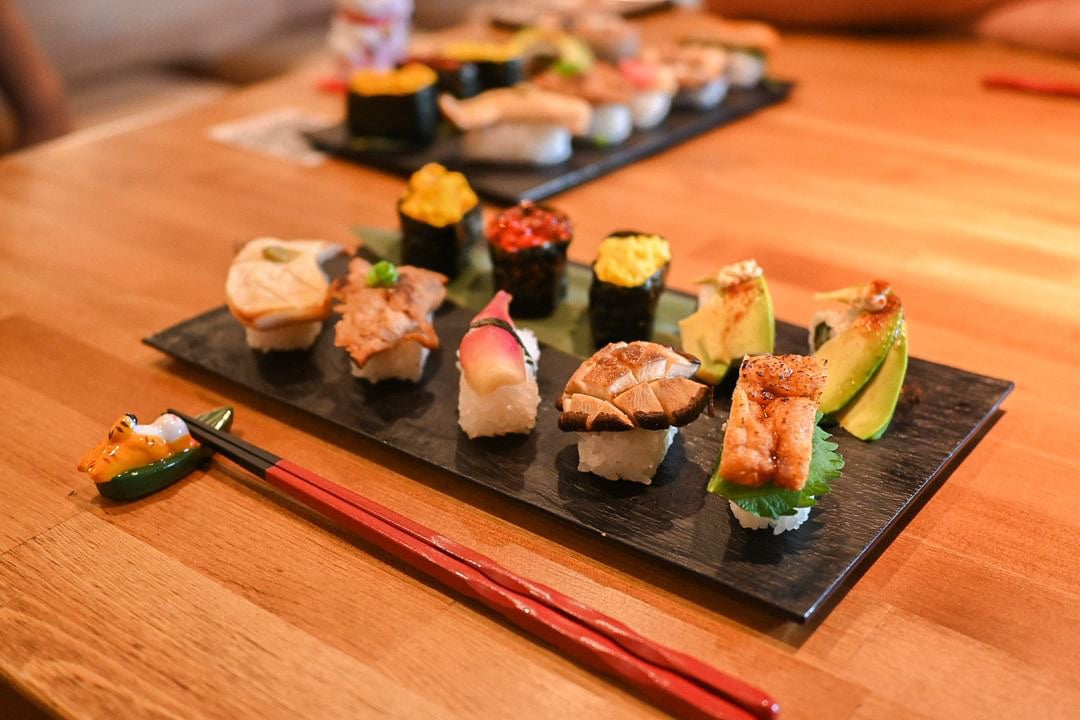 日本伝統のお寿司を、野菜や植物卵・いくらなど日本独自の植物食材を使い、ヴィーガナイズしました。