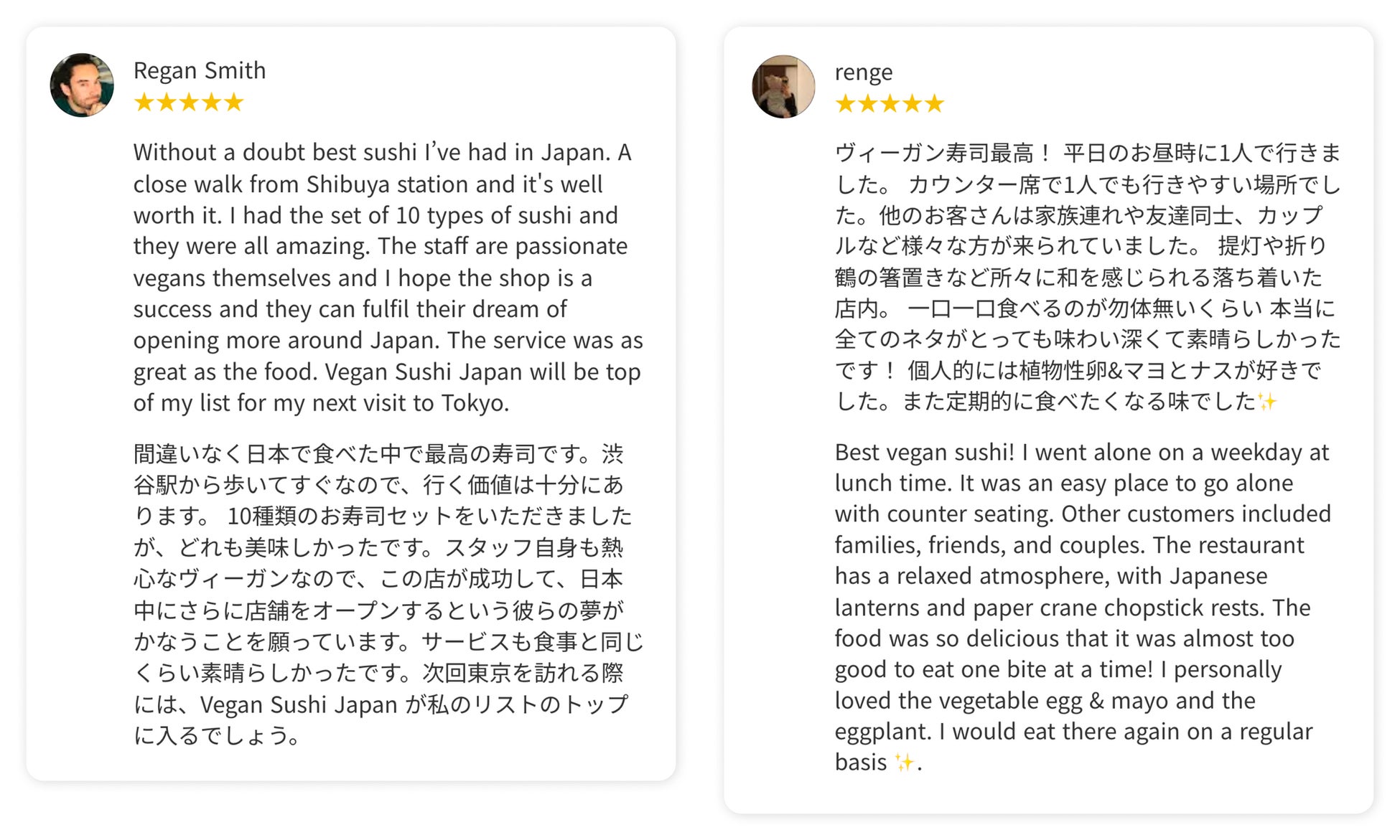 Google Mapsのレビューは100件以上・総合評価星5.0となり、ヴィーガン寿司の体験を高く評価いただいています。