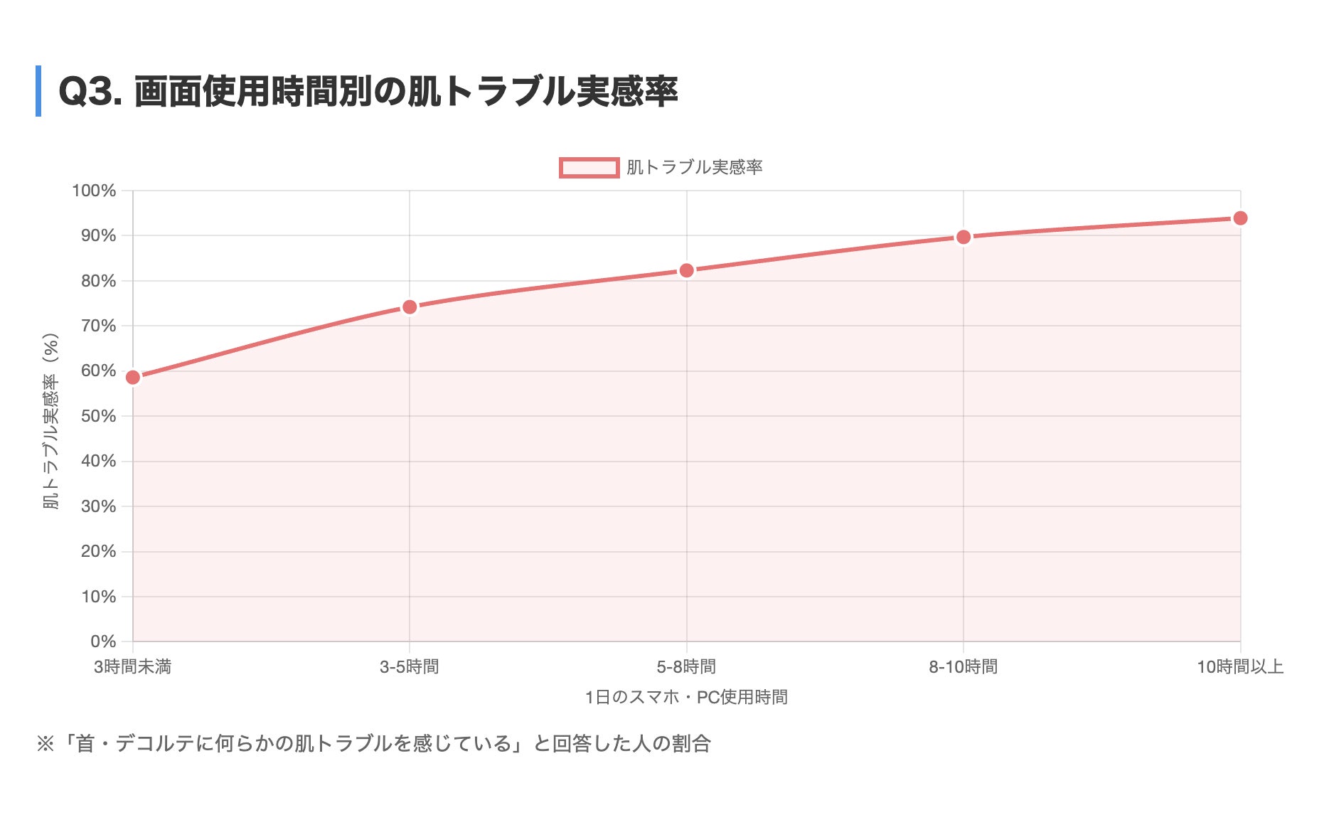 画面使用時間が長いほど肌トラブル実感率が高まる傾向があり、10時間以上では93.9%に達する