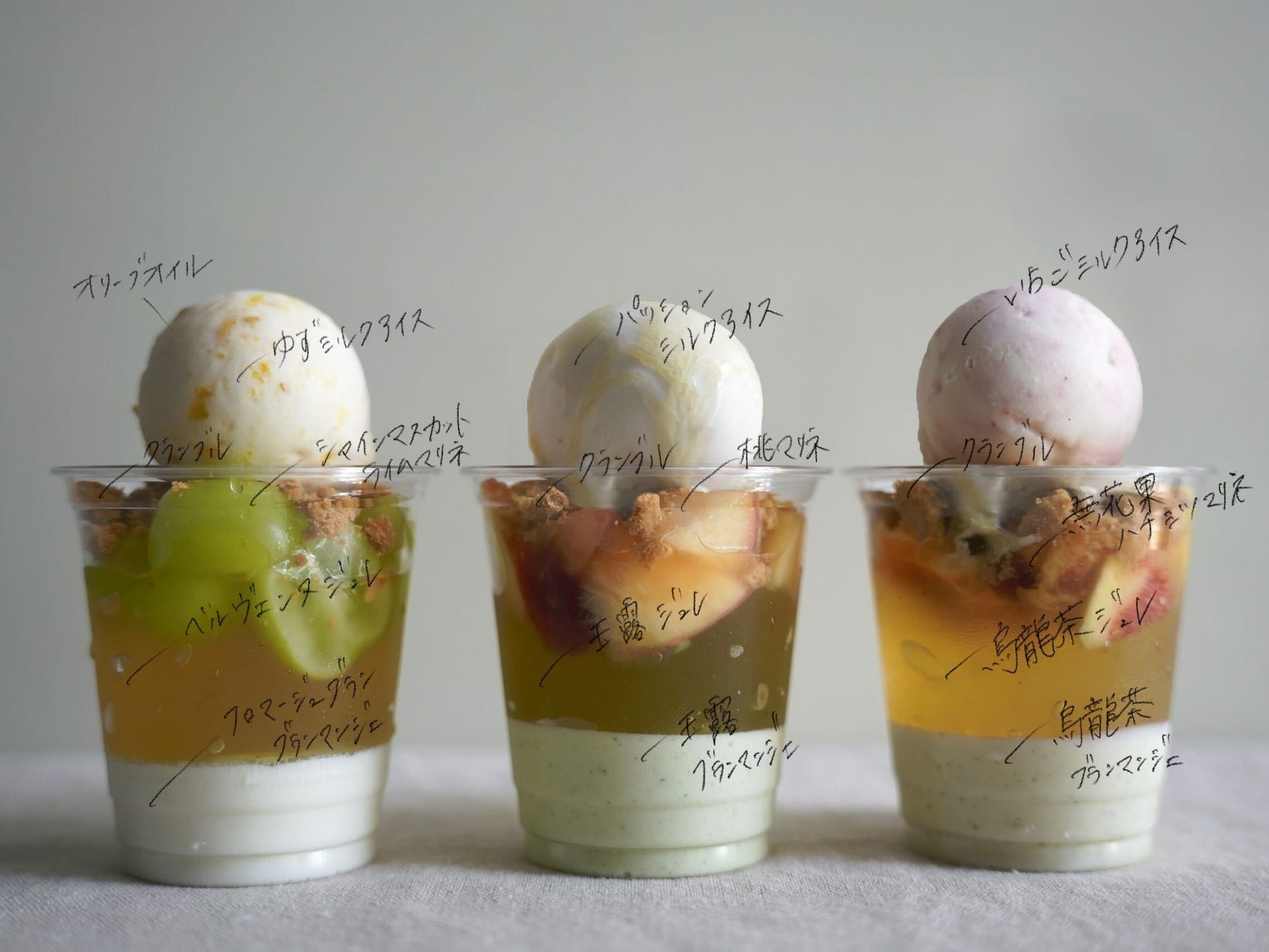 パフェは、全部で3種類。easeのフルーツマリネ、ブラマンジェに、tealのアイスクリームを合わせました。玉露のブラマンジェにパッションミルクアイスなど、ユニークな味の組み合わせをお楽しみいただけます。
