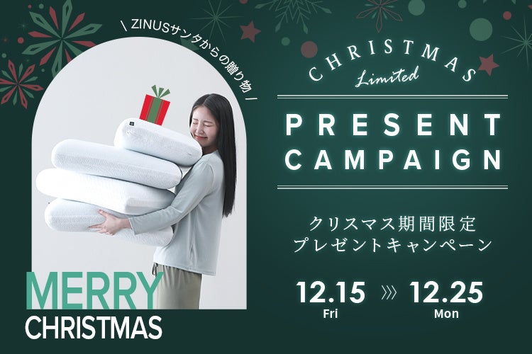 ZINUSは、12月15日(金)~12月25日(月)の期間に「ZINUSサンタからの贈り物 クリスマスプレゼントキャンペーン2023」を開催いたします。キャンペーン期間中に、ZINUS公式サイトで税込10,000円以上のマットレス・ベッドフレームをお買い上げのお客様を対象に、「GreenTea 枕」、「Dual 枕」、「GreenTea-Traditional 枕」、「Traditional-Gel 枕」のまくら4種のうち1点をプレゼントいたします。