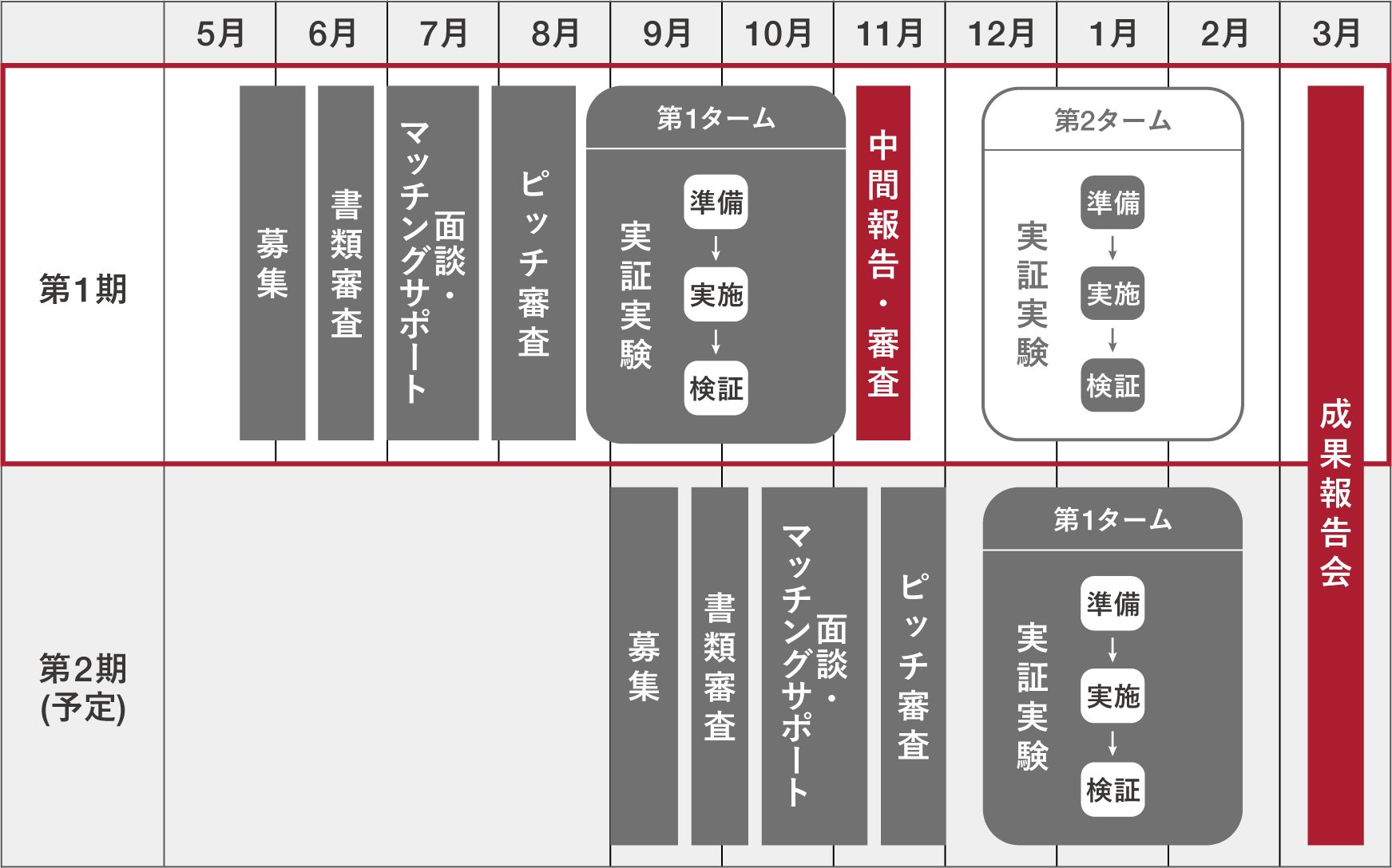 ・各タームの実証にかかる費用は、ピッチ審査を行ったうえで、決定します。