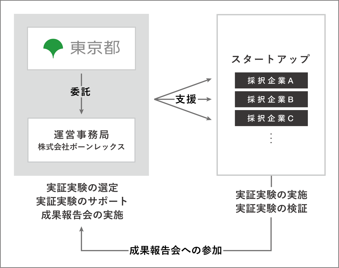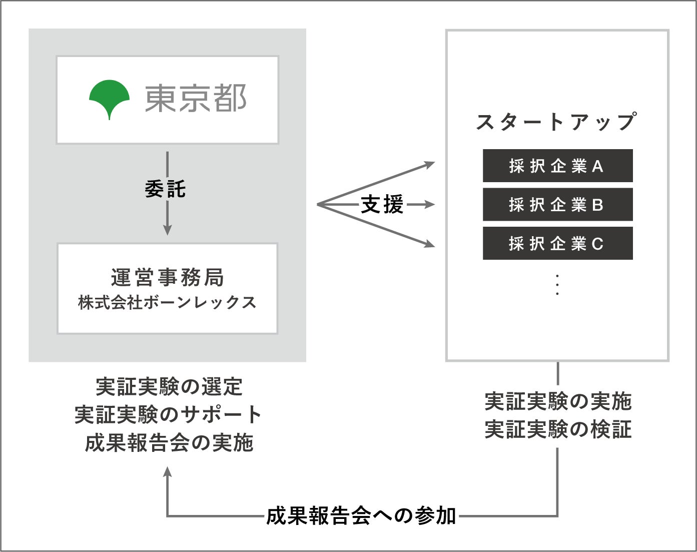 ・実証実験の実施にかかる費用について、審査を行ったうえで、運営事務局を通じて東京都が負担します。