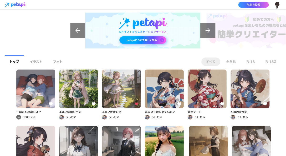 「petapi(ペタピ)」は、AIを用いて作成した画像をはじめ、動画やプロンプト、テキスト、音声など様々なコンテンツを投稿できるサービスです。