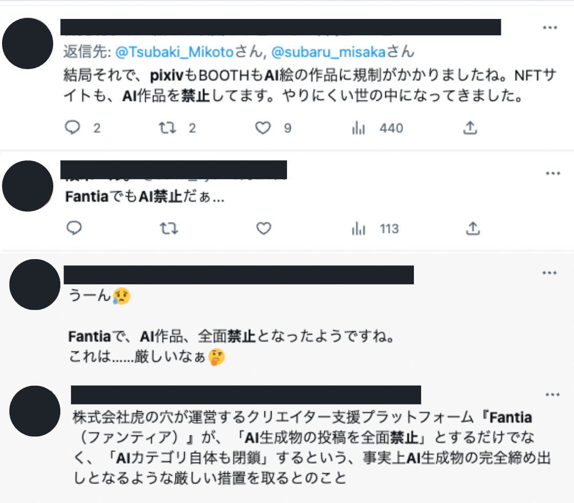 そこに、画像生成AIを用いてコンテンツを作成するクリエイターが突如として現れたことで、サービスが混乱し、画像生成AIを用いて作成したコンテンツの投稿の制限や、おすすめに表示されにくくなる仕様となってしまっているサービスが多数あります。