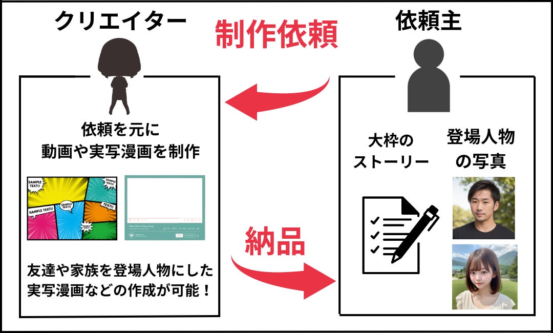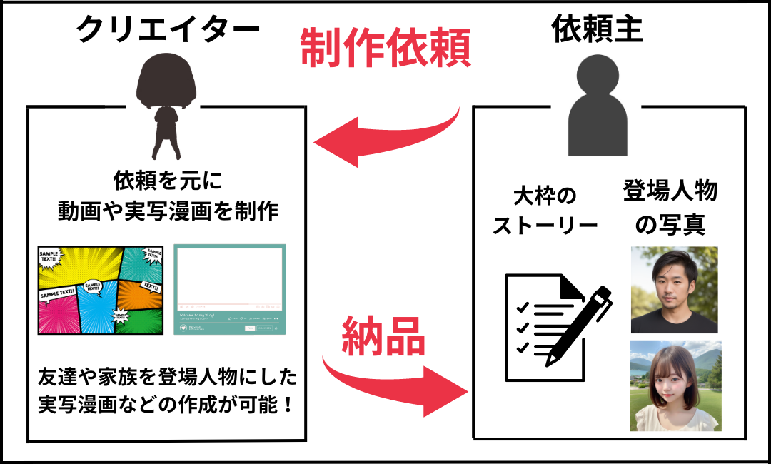 記念日に渡す実写創作漫画や動画などをクリエイターに依頼することが可能