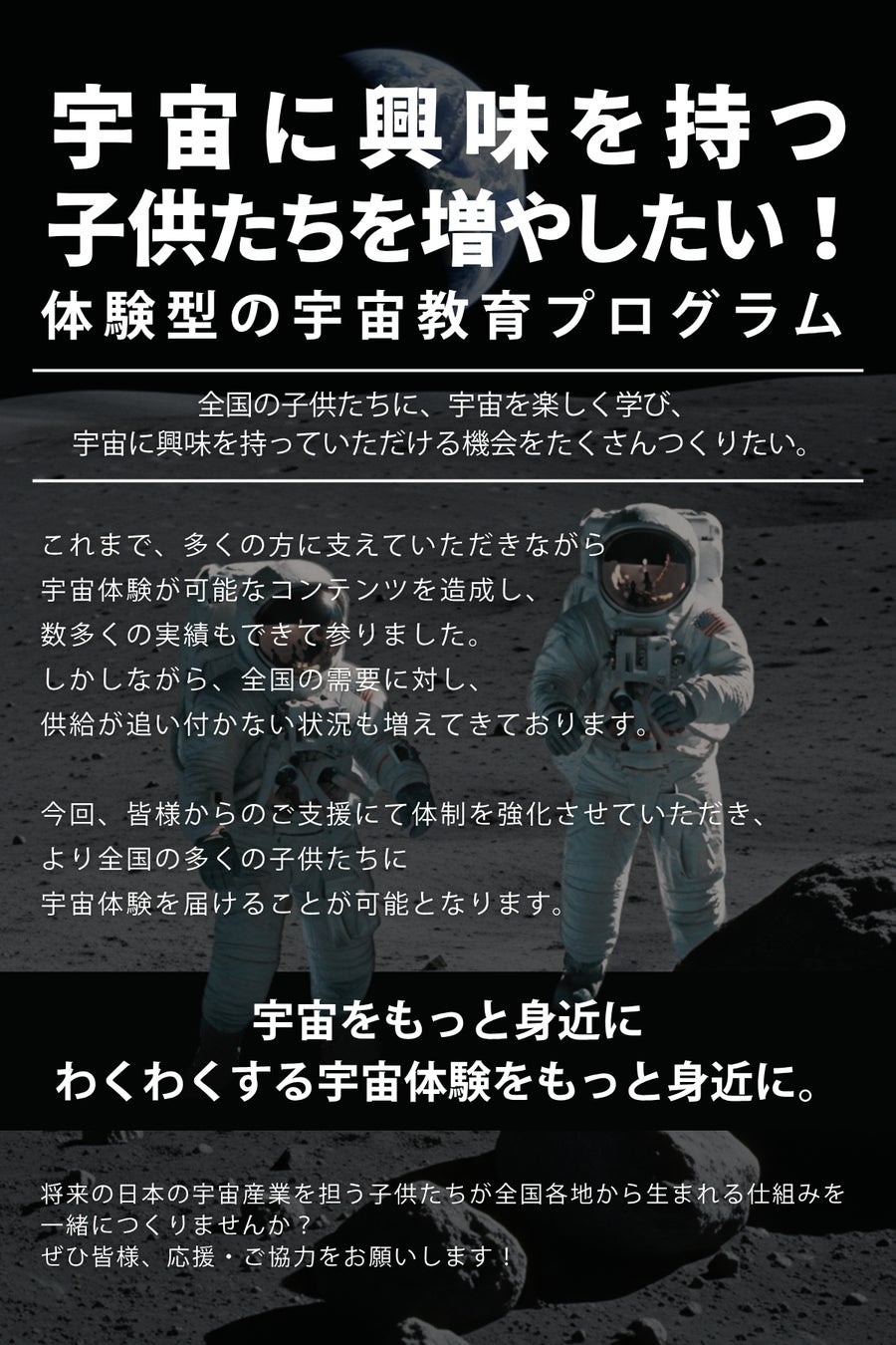 今回、amulapoの取り組みを社会へ広く発信し、全国の子供たちへ届ける体制を強化させていただくためにクラウドファンディングを実施することにしました。ぜひ、皆さまには将来の日本を考える仲間として本プロジェクトにご参画をいただき、宇宙教育の仕組みづくりを応援、ご協力をいただけますと幸いです。