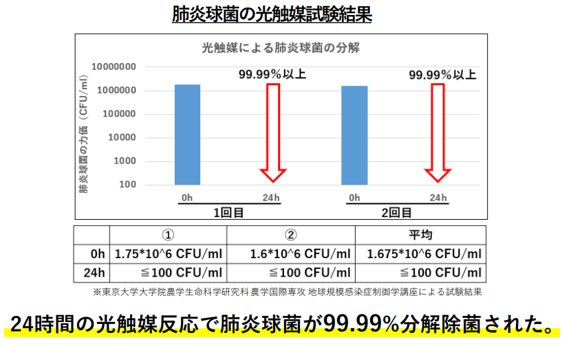 肺炎の原因として最も多い細菌『肺炎球菌』を、光触媒が99.99%分解することを実証。