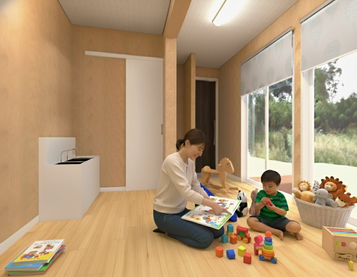 今回採択された増築案では、断熱等級6・耐震等級3の高性能ユニットを用い、既存園舎とデッキ接続して利用できる可変型の空間を整備します。