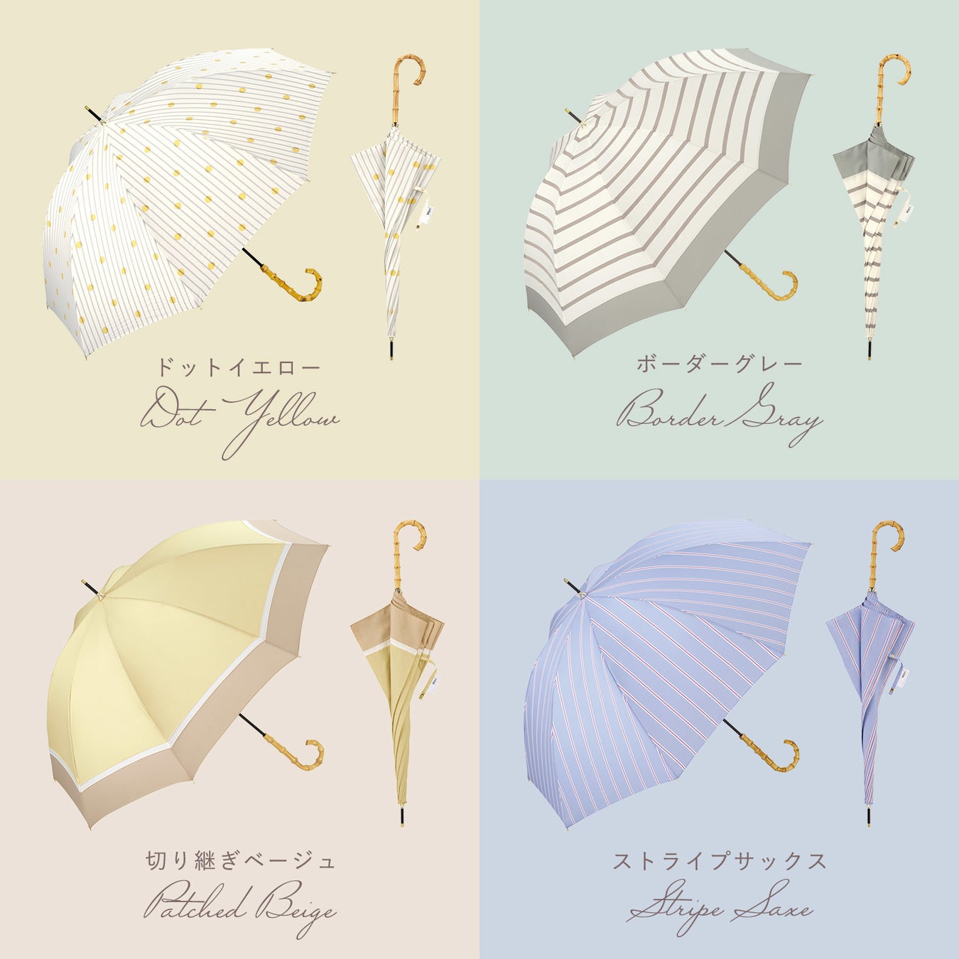 ベーシックバンブーアンブレラは楽天市場レディース雨傘部門の週間ランキング1位を獲得するなど、大人気のロングセラー商品。人気のバンブー持ち手とゴールドパーツの組み合わせは洗練された印象になります。これまでに発売した13デザインも取扱いを継続しており、新柄を含む全20デザインの展開です。