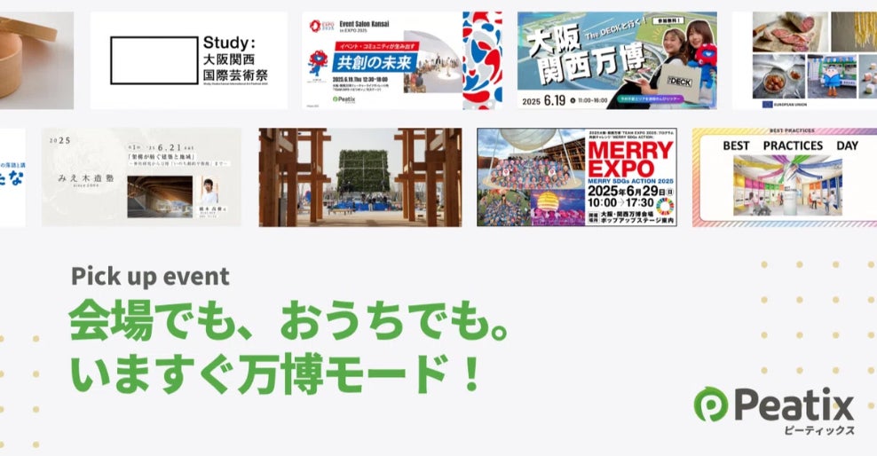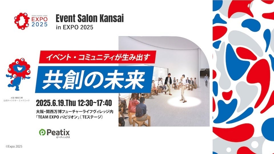 イベント・コミュニティのプラットフォーム・ピーティックス ( Peatix ) を運営するPeatix Inc.(本社 :米国ニューヨーク州、CEO:原田 卓、以下「ピーティックス」) は、2025年6月19日(木)、大阪・関西万博フューチャーライフヴィレッジ内「TEAM EXPO パビリオン」にて、”共創”をテーマにした特別イベント『Event Salon Kansai in EXPO 2025 〜イベント・コミュニティが生み出す共創の未来〜』を開催いたします。