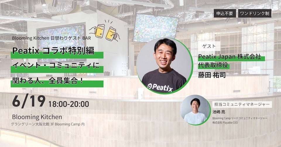 イベント終了後、大阪・梅田のBlooming Kitchen(Blooming Campオープンコミュニケーションエリア内)にて、交流を深めるアフターパーティを開催いたします。参加者同士のネットワーキングを通じて、新たな共創の種を育む場となるよう企画しています。