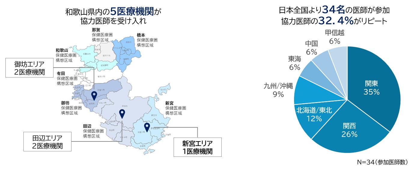 2024年度の「わかやま医療版ワーケーション」においては、病院で勤務する医師が特に不足、高齢化している御坊、田辺、新宮の医療圏の5医療機関が協力医師を受け入れ、日本全国から34名の医師が合計48回の勤務に参加し、協力医師の32.4%にあたる11名がリピートしました。