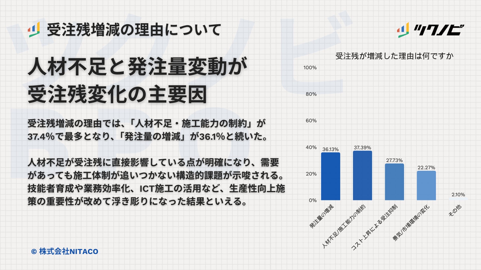 受注残増減の理由では、「人材不足・施工能力の制約」が37.4%で最多、「発注量の増減」が36.1%と続きました。「コスト上昇による受注抑制」は27.7%、「景気・市場環境の変化」は22.3%でした。