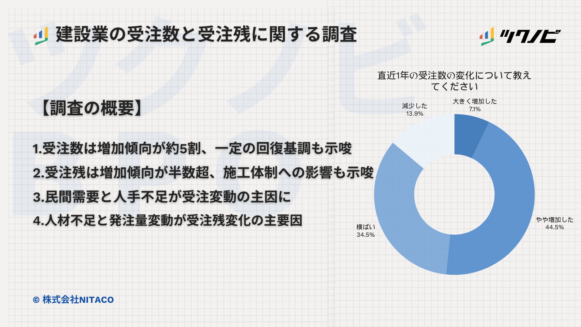株式会社NITACO(本店:東京都渋谷区、代表取締役:新田 顕大)は、建設業従事者238名を対象に、「建設業の受注数と受注残に関する調査」を実施しました。