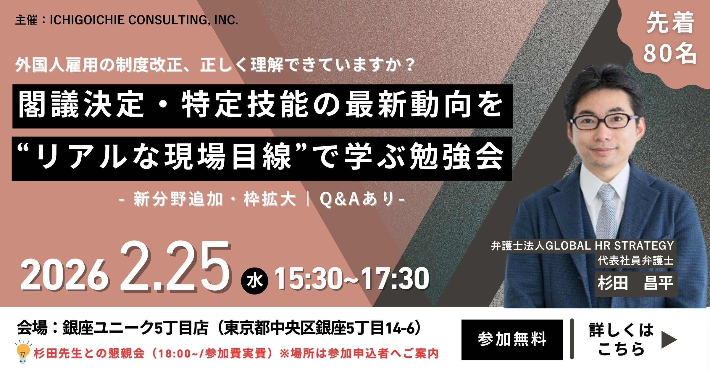 こうした背景を踏まえ、ICHIGOICHIE CONSULTING, INC.(本社:フィリピン、代表取締役:三浦一生)とIkon Solutions Asia Inc. (本社:フィリピン、代表:パオロ・ロベルト・マルテル)は、外国人受入れに関わるすべての実務者・関係者を対象とした勉強会「閣議決定・特定技能制度の最新動向を“リアルな現場目線”で学ぶ勉強会」を2026年2月25日(水)、東京・銀座にて開催いたします。