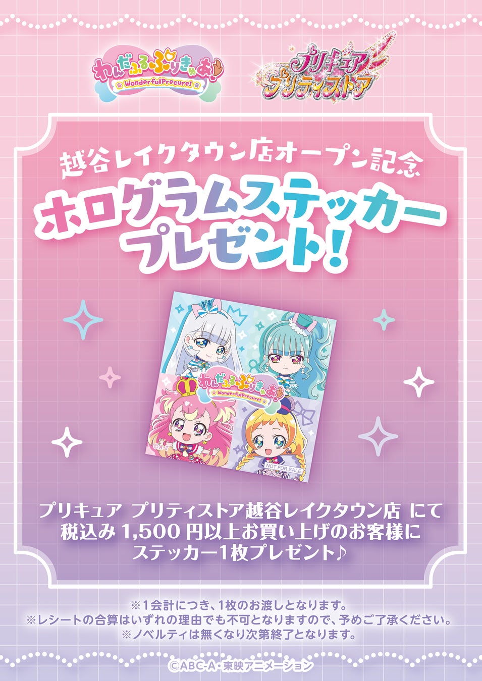 2023 年 2 月より、プリキュア 20 周年記念店舗として期間限定で営業していましたが、大好評につき、常設店舗としてリニューアルオープンすることとなりました。現在、東京・大阪・横浜の 3 店舗で常設店として営業しており、『プリキュアプリティストア越谷レイクタウン店』で4 店舗目となります。