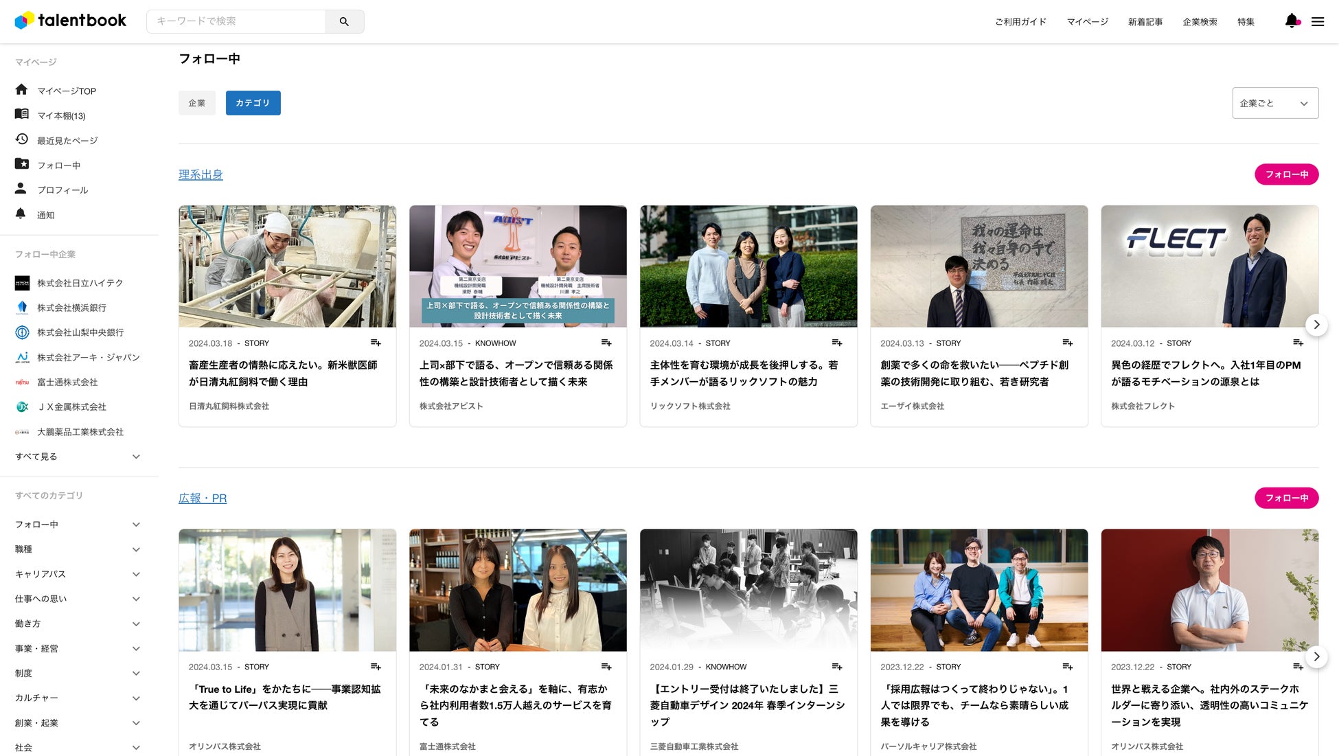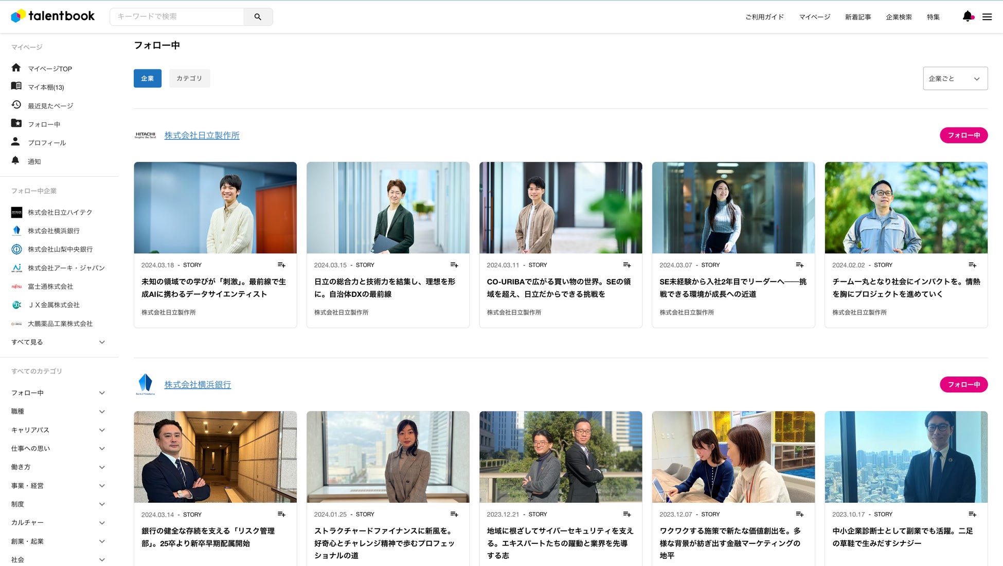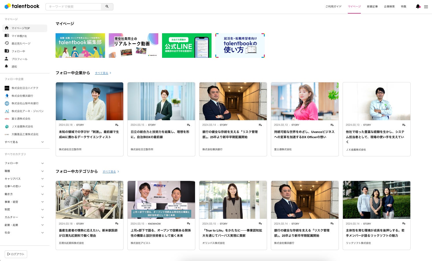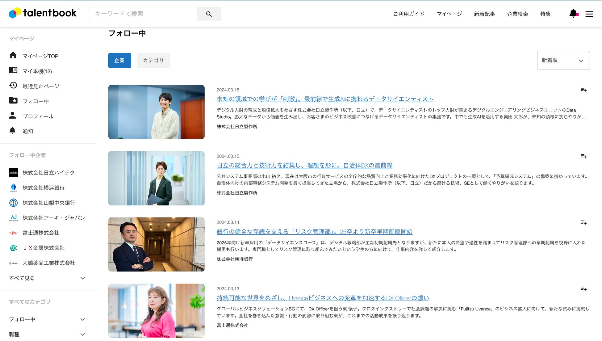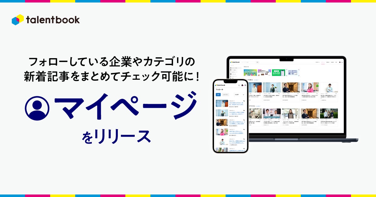 このたび、talentbookの会員に向けてマイページをリリースし、企業・カテゴリの新着を一気に確認できるようになり、自分の興味関心に沿った記事を見つけやすくなりました。