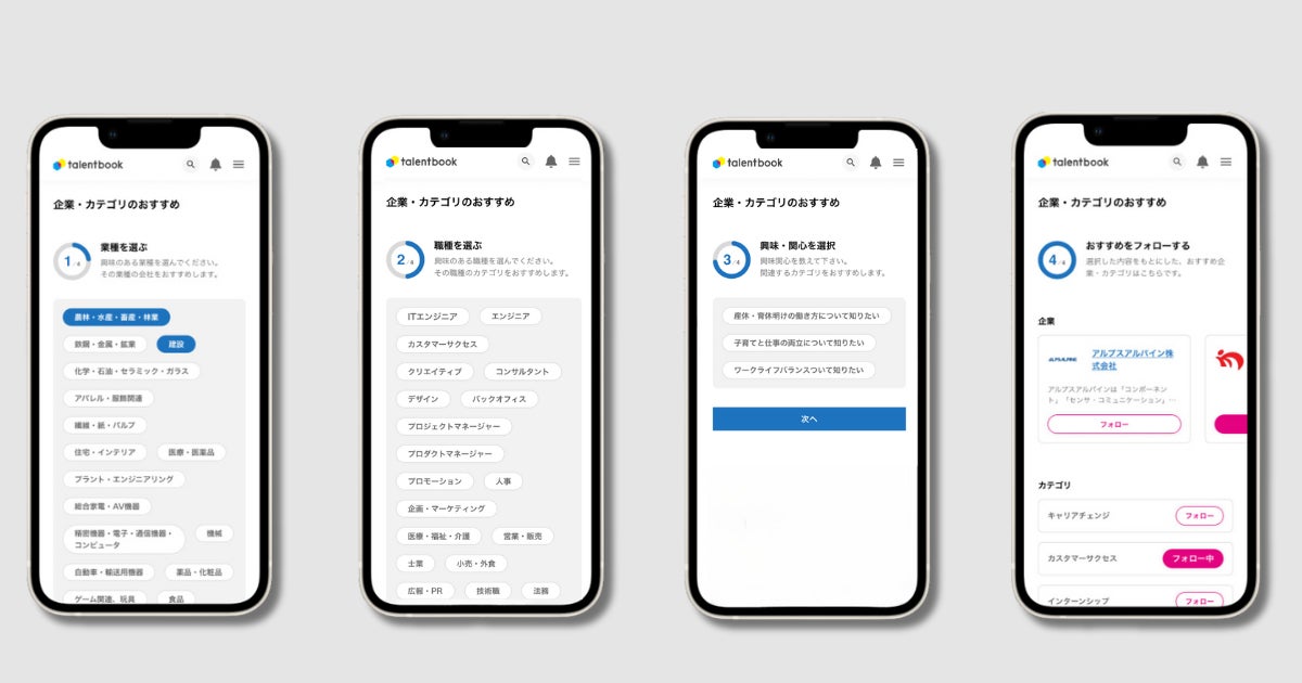 「talentbook」の新規会員登録時、気になる「業種」「職種」「興味・関心」を選択することで、それぞれの選択結果に基づいた、おすすめの企業とカテゴリが表示されます。