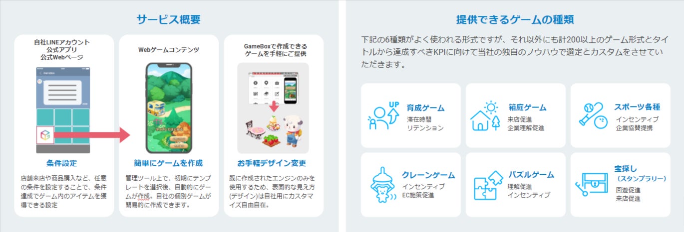 『GameBox』は当社が開発した「ゲーミフィケーションメソッド」を活用し、顧客のロイヤリティ向上を目的とした手軽に自社オリジナルゲームを作れるサービスです。