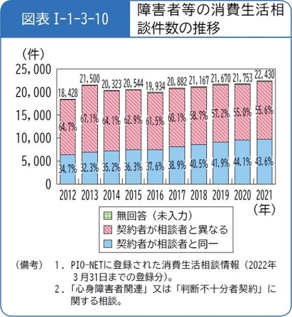 また、消費者庁が公表してる令和4年版消費者白書※によると、障がい者の消費生活相談件数は、2012年と2021年を比較すると約1.2倍増加しています。