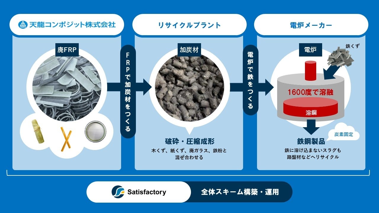 FRP(繊維強化プラスチック)製品の製造・販売を行う天龍コンポジット株式会社(岐阜県加茂郡)は、ケミカルリサイクル「電炉CCS法」を活用し、従来リサイクルが困難とされた製造端材の再資源化に成功しました。2025年2月の運用開始からわずか4か月で、合計12トン超の処理実績を達成しています。本取り組みは、脱炭素と循環型社会への貢献に加え、素材・化成品業界の「FRPは埋立処理が前提」という常識を覆すものです。資源物流のスキーム構築と運用は、株式会社サティスファクトリー(東京都中央区)が担い、実践的なモデルケースとして展開することができました。