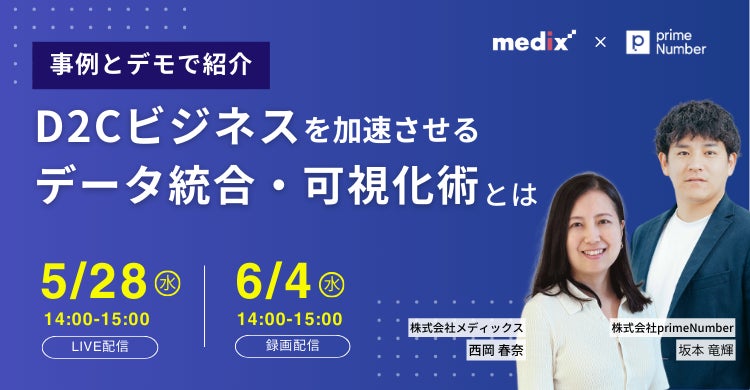 インターネット黎明期から企業のデジタルマーケティングを支援する株式会社メディックス(本社:東京都千代田区、代表取締役:田中正則、以下メディックス)は、D2C事業者様向けに、オンラインセミナー「 【事例とデモで紹介】D2Cビジネスを加速させるデータ統合・可視化術とは」を株式会社primeNumber (本社:東京都品川区、代表取締役:田邊 雄樹、以下primeNumber)と共催で実施いたします。