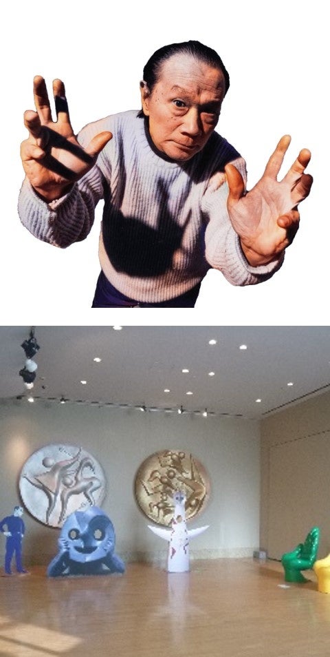 スマートフォンをかざすと、AIの技術を使ってカラー化した岡本太郎や様々な作品と一緒に記念撮影することができます。