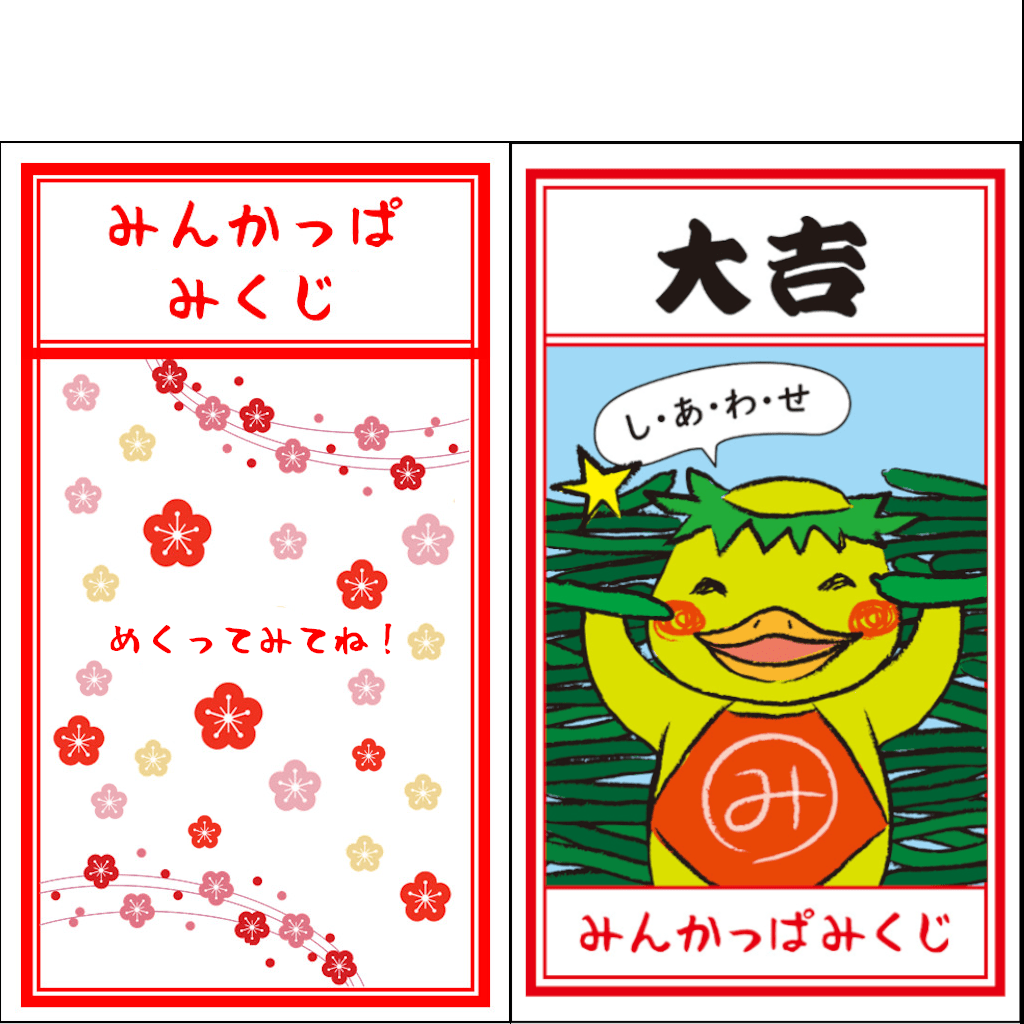 スマートフォンかざして振ると、楽しい音楽とともに、3Dのおみくじを引くことができます。筒から、民家園キャラクター“みんかっぱ”たちのおみくじが出てきます。