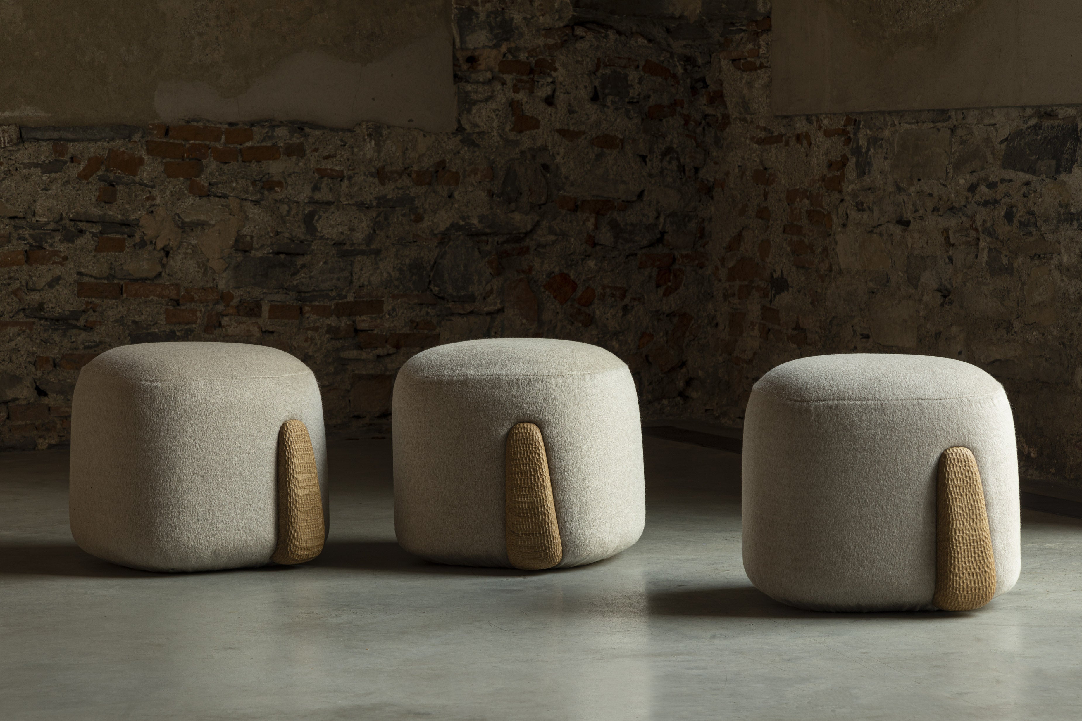 コルティーレ・デッラ・セタの中心にある塔の間に、ソファ、スツール、ベンチ、テーブルなど、モハデッドのデザインによる家具が並んでいます。ロロ・ピアーナ・インテリアの極上の質感の素材を使い、まるで石のように柔らかな印象に仕上げています。丸みを帯びた部分には手彫りの木のパーツが用いられ、石の間にある岩のように安定感を与え、物を置くための面を作り出し、コントラストを生み出しています。木と生地は、第3の素材であるセラミックと出会い、その色はアルゼンチンのラグーンからインスピレーションを得て、塔の色と同じ赤と白で表現されています。すべてはこの風景の素晴らしい自然のパレットから生まれました。テーブルの表面にはセラミックが使われ、家具の間に小さなラグーンを作り出します。