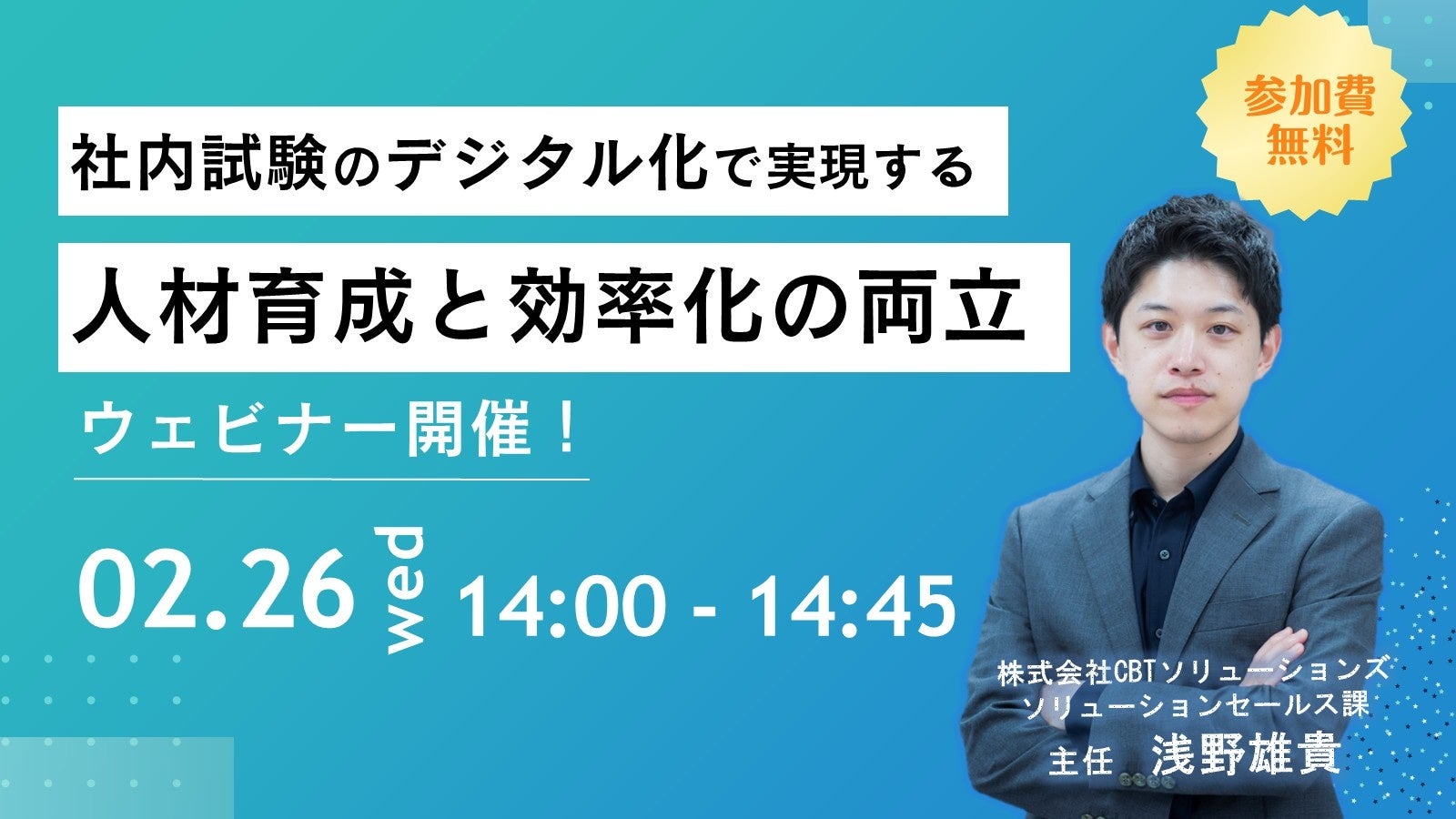CBT・IBT試験等の試験運営業務をメイン事業とする株式会社CBTソリューションズ(本社:東京都千代田区、代表取締役社長:野口功司、以下CBTS)は、2月26日(水)14:00~14:45にて無料ウェビナー『社内試験のデジタル化で実現する、人材育成と効率化の両立』を開催いたします。