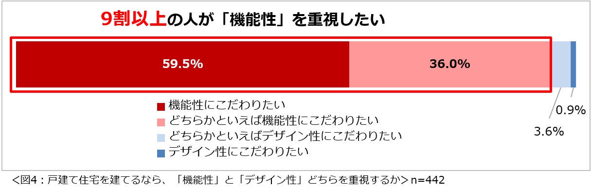 もし戸建て住宅を建てるなら、「機能性」と「デザイン性」のどちらを重視するか尋ねたところ、「機能性にこだわりたい」(59.5%)と回答した人が最も多く、「どちらかといえば機能性にこだわりたい」(36.0%)という人と合わせると、95.5%の人が「機能性」を重視したいと思っていることが分かりました(図4)。