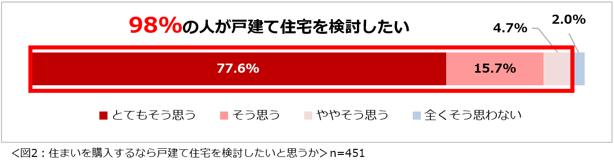 「住まいを購入するなら、戸建て住宅を検討したいと思いますか?」と尋ねたところ、「とてもそう思う」(77.6%)、「そう思う」(15.7%)、「ややそう思う」(4.7%)と回答した人は合わせて98.0%(451名中442名)でした(図2)。