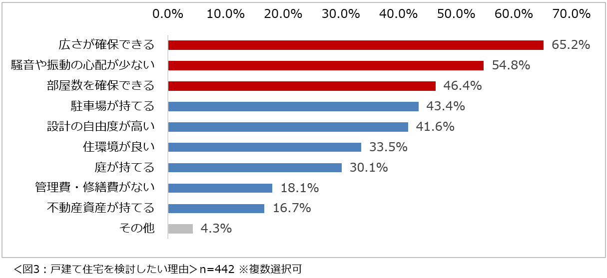 戸建て住宅を検討したい理由については、「広さが確保できる」(65.2%)と回答した人が最も多く、「騒音や振動の心配が少ない」(54.8%)、「部屋数を確保できる」(46.4%)と続きました(図3)。