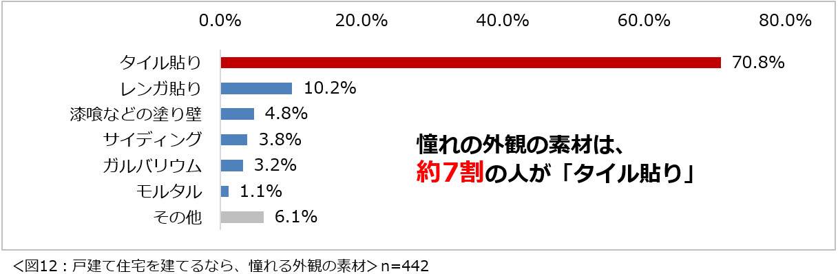 「もし戸建て住宅を建てるなら、憧れの外観の素材は何ですか?」と質問したところ、「タイル貼り」が突出して多く、70.8%に上りました(図12)。