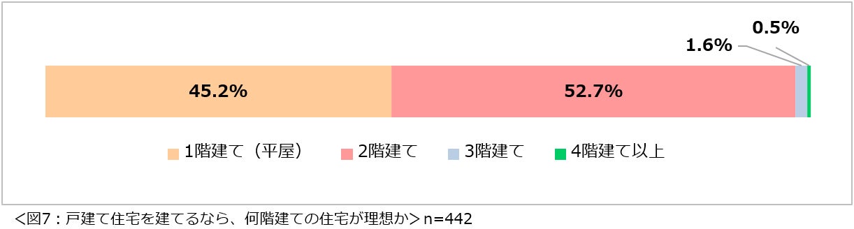 「もし戸建て住宅を建てるなら、何階建ての住宅が理想ですか?」という質問をしたところ、「2階建て」(52.7%)と答えた人が最多となりました。次いで「1階建て(平屋)」(45.2%)も人気で4割以上の人に選ばれました(図7)。