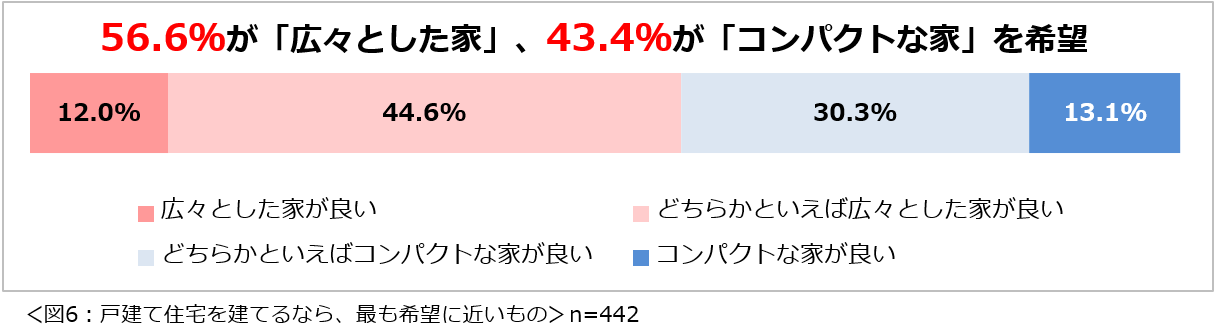 これから家を建てるなら、56.6%が「広々とした家」派、43.4%が「コンパクトな家」派と分かれる結果に。