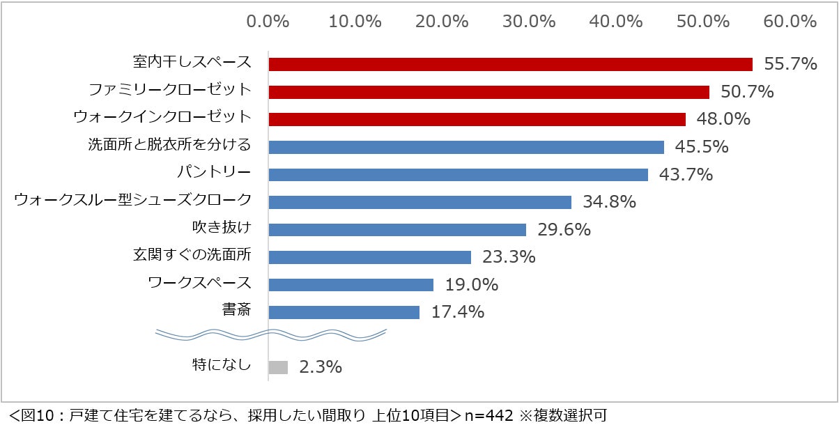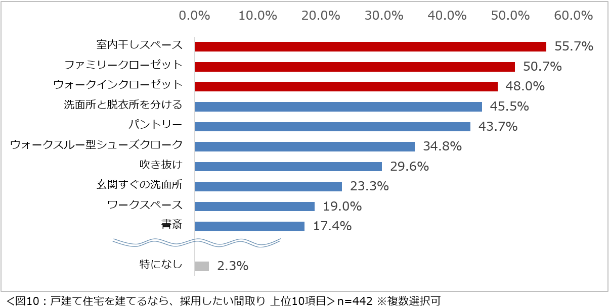 「間取り」では、「室内干しスペース」(55.7%)が最多となりました。さらに、「ファミリークローゼット」(50.7%)や、「ウォークインクローゼット」(48.0%)などの収納関連も上位になりました(図10)。