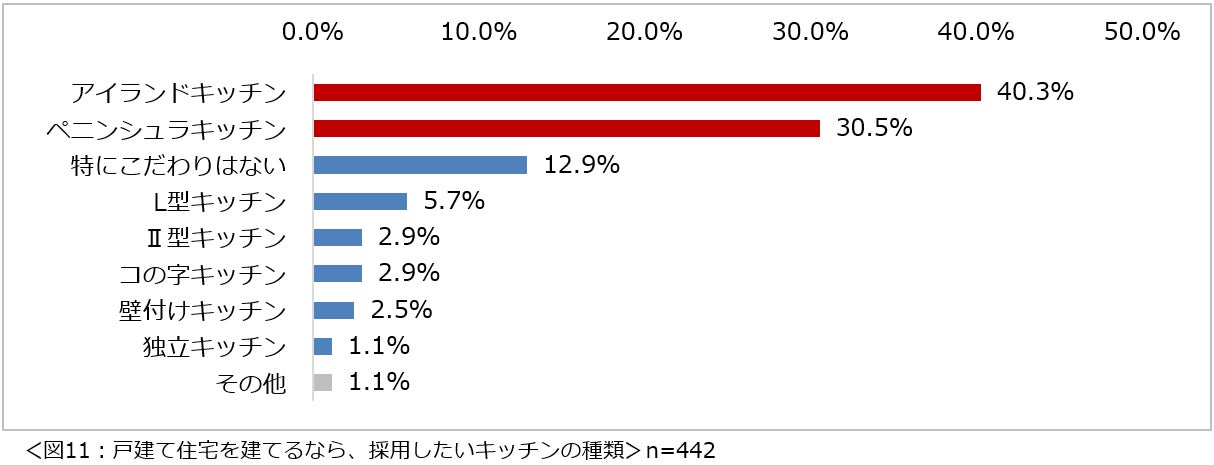 「もし戸建て住宅を建てるなら、採用したいキッチンの種類」について尋ねたところ、1位は、周囲に壁がなく、文字通り島のように設置されている「アイランドキッチン」(40.3%)、2位は、キッチンの左右どちらかが壁に接している「ペニンシュラキッチン」(30.5%)でした。両方合わせると7割以上の人がオープンキッチンを希望。一方、「特にこだわりはない」と回答する方が12.9%と、一定数いることがわかりました(図11)。