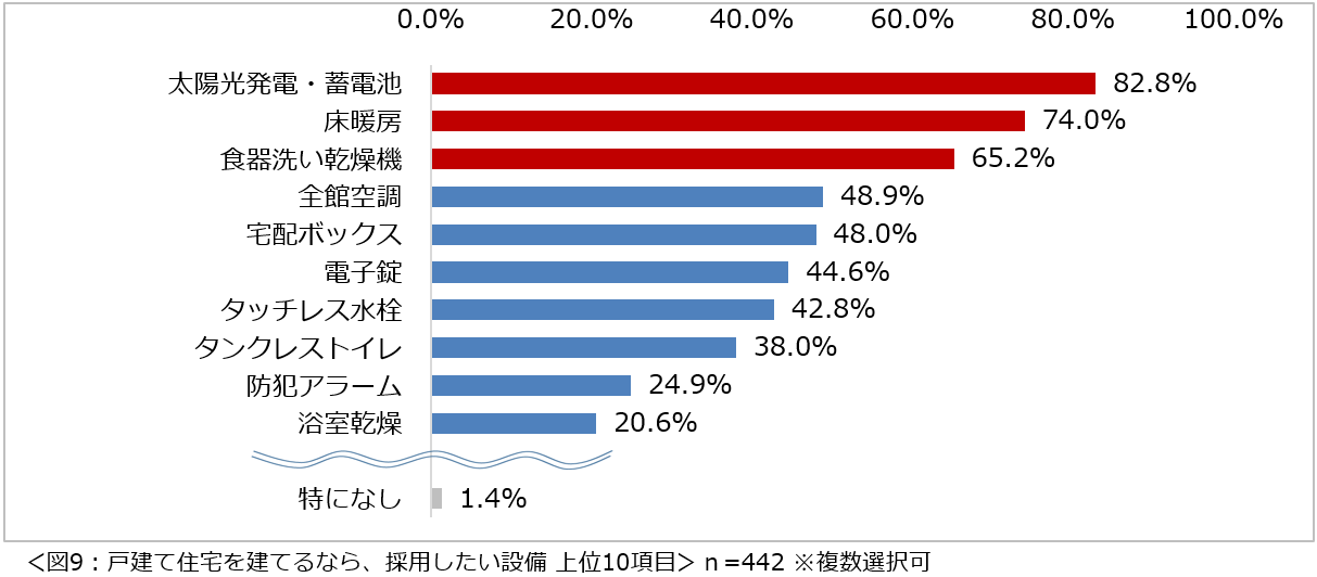 もし戸建て住宅を建てるなら、採用したい「設備」と「間取り」について尋ねたところ、設備面での1位は「太陽光発電・蓄電池」(82.8%)でした。また、2位は「床暖房」(74.0%)、3位は「食器洗い乾燥機」(65.2%)と続きました(図9)。