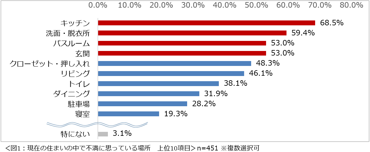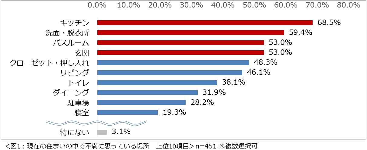 まず、「現在の住まいの中で、不満に思っている場所」を尋ねたところ、「キッチン」(68.5%)という回答が最も多く、次いで2位が「洗面・脱衣所」(59.4%)、3位が同率で「バスルーム」「玄関」(53.0%)という結果に。特に水回りに不満を持っている人が多いことが明らかになりました(図1)。