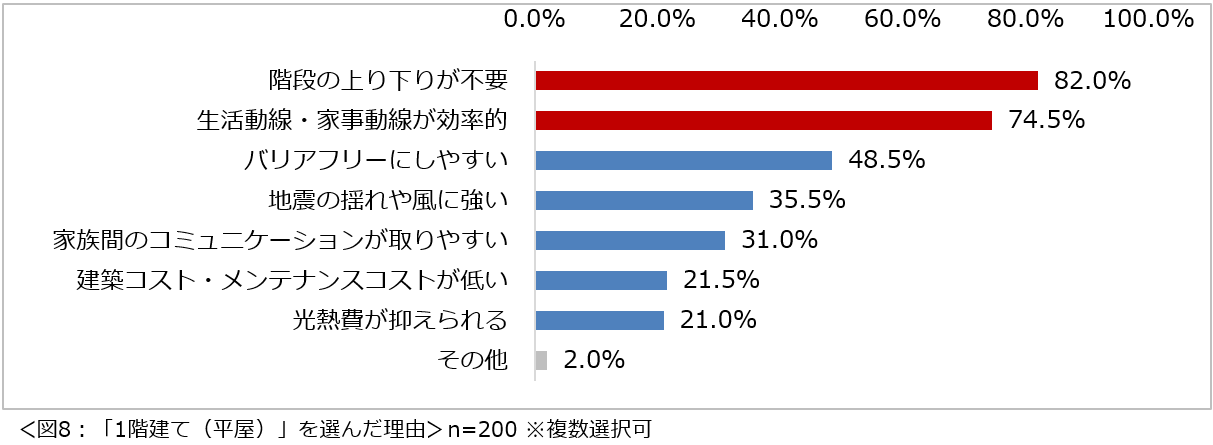 なお、「1階建て(平屋)」が良いと回答した200名に、その理由について尋ねたところ、「階段の上り下りが不要」という回答が82.0%と最も多く、また、「生活動線・家事動線が効率的」と考える人も74.5%で、暮らしやすさが理由として挙げられていることが分かりました(図8)。