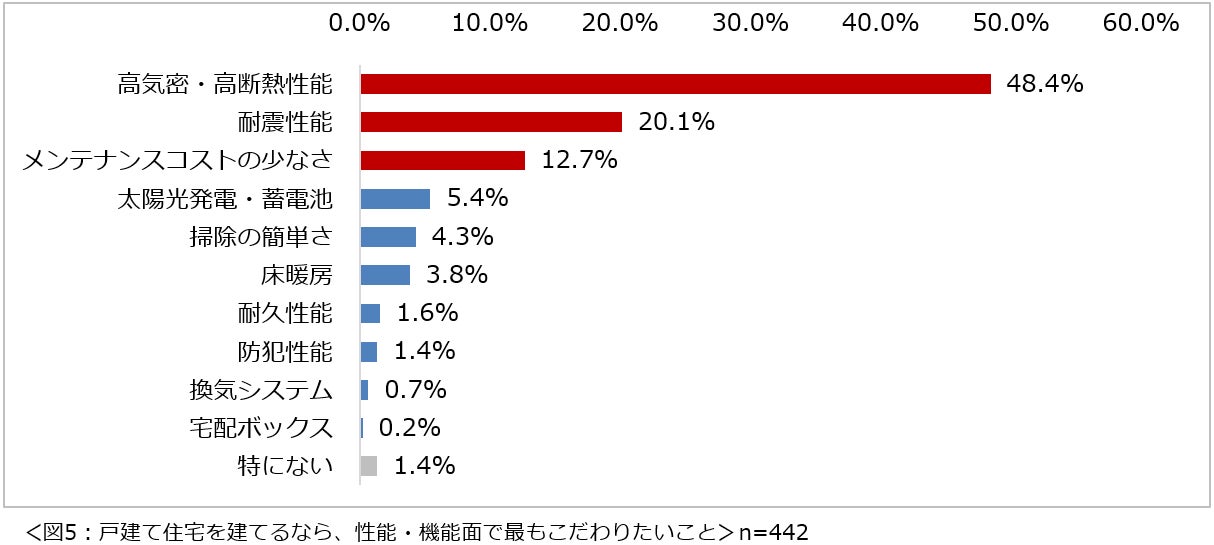 「もし戸建て住宅を建てるなら、性能・機能面で最もこだわりたいことは何ですか?」という質問をしたところ、「高気密・高断熱性能」(48.4%)という回答が突出して多く、続いて、「耐震性能」(20.1%)や「メンテナンスコストの少なさ」(12.7%)が挙げられました(図5)。