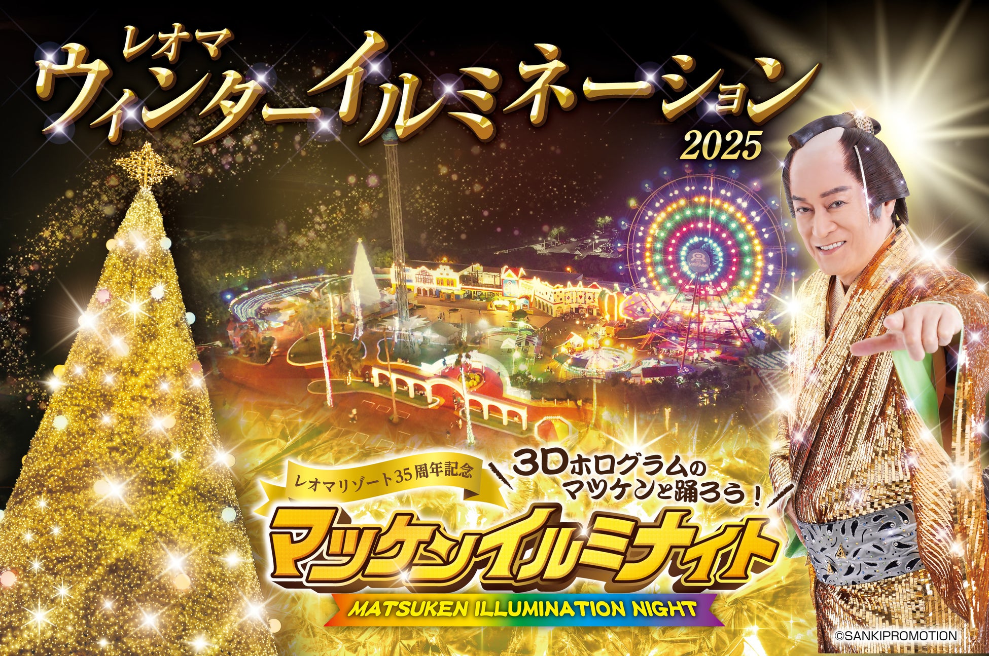 香川県を代表する冬のイルミネーションとして人気の高いレオマリゾートでは、中四国最大級約250万球のウィンターイルミネーションを開催します。今年は、3Dホログラム映像と光・音楽が融合したショー演出で、来場者を“マツケンの世界”へと誘います。光るサンバ棒を手に踊る「風の道」や、日本一長いエスカレーター「マジックストロー」のマツケンイルミなど、園内全体が熱気に包まれるイベントです。『International Illumination Award 2025』で「イルミネーションイベント部門 優秀エンタテインメント賞」第4位を獲得しました。