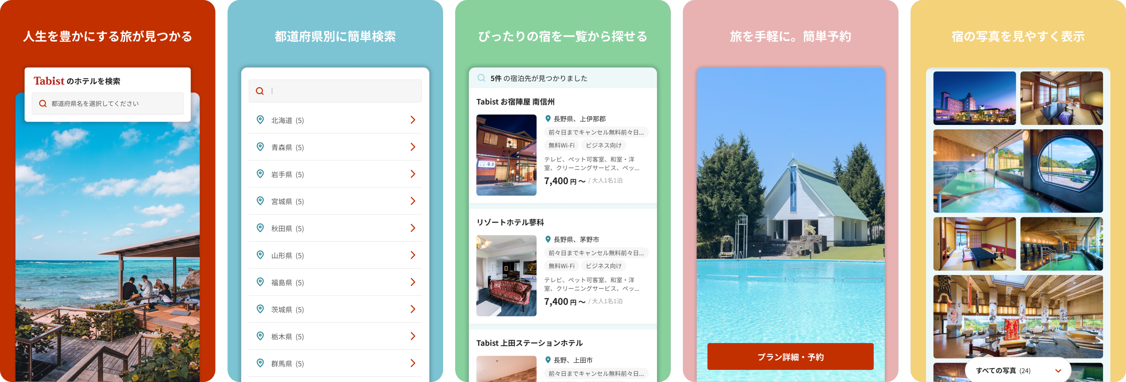 Tabistが新しくローンチしたアプリでは、人生を豊かにする旅を見つけられます。都道府県別に検索ができるため、日本国内の都道府県から、興味のあるエリアを簡単に検索できるほか、Tabistパートナーシッププログラムを通じ、加盟しているホテルや旅館には、ダイナミックプライシングとOTAマネジメントを導入しているため、アプリ内において適正な価格が表示されます。また、豊富な宿泊施設の画像から、まだ見ぬ土地や宿泊施設の発見や、新しい旅体験の想起を提供します。